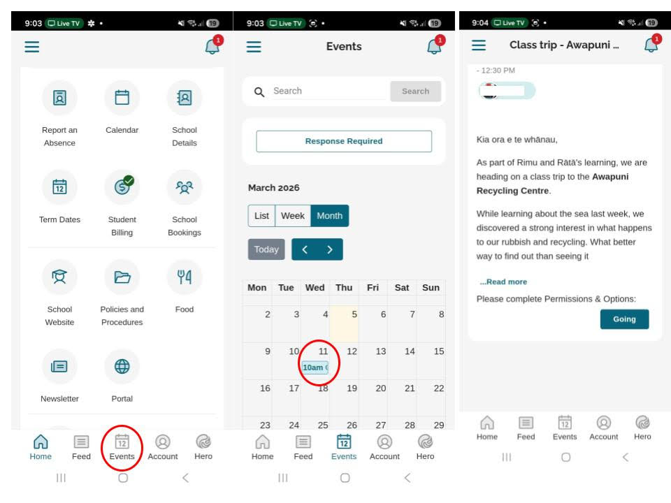 The Hero app has had an upgrade and we can now use it to publish events, get permissions and transport etc. You may have already received a notification about one of these events. The picture above shows how this works on your app if you haven’t figured it out yet.