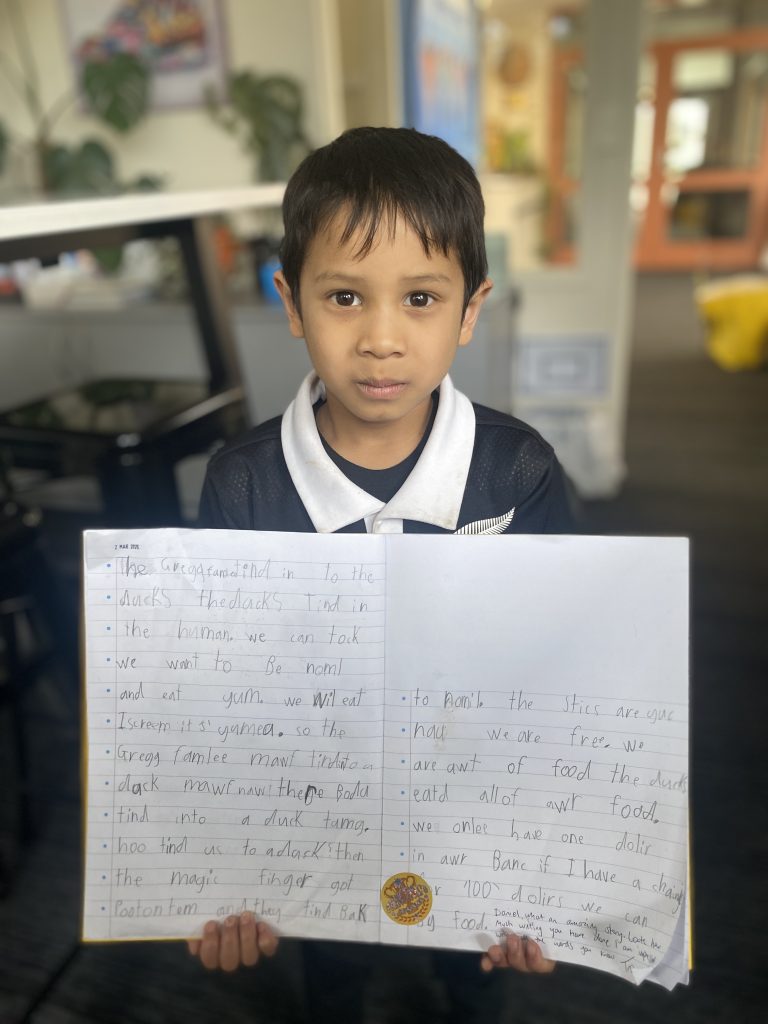 Earlier in the week Daniel came to share with me his amazing writing he did. Check it out above, not bad for someone who has just turned 6? I love that we can see how you sounded words out independently and had a go – Ka pai tō mahi Daniel! (Great work)