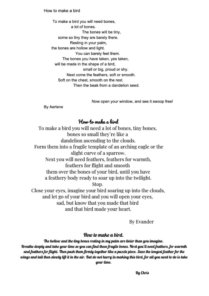 You might remember last week, I shared with you all some writing from Kauri inspired by Meg McKinlay’s book ‘How to Make a Bird.’ Dr. Chrissie Braid, who worked alongside Faye on this, got in touch with her and shared how they used her book for their writing and she responded: “Please tell the kids that I really enjoyed their work and that I found it genuinely inspiring reading their responses. It was helpful for me to read what Chris wrote: “All you need to do is take your time” as I have been struggling with a novel for about three years now and it is so important to be reminded that it will come eventually. I was also very taken by Aerlene‘s use of language in “the bones you have taken, yes taken” was a lovely example of cadence and breathwork and there is a real feel for poetry there and also in ‘soft on the chest, smooth on the rest’. And Evander‘s, that single-word line of ‘Stop’ and his last clause of ‘that bird made your heart’ was stunning too.” What outstanding writers we have, recognised by someone who makes a living out of writing.